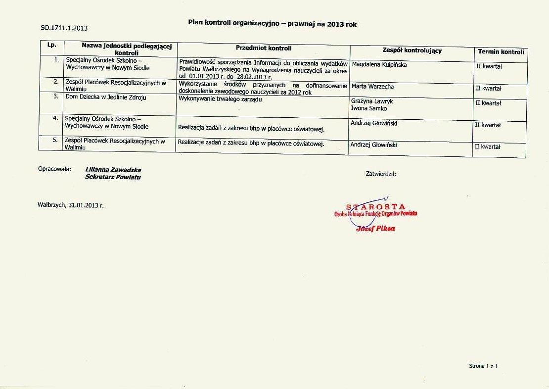 Plan kontroli organizacyjno - prawnej na rok 2013